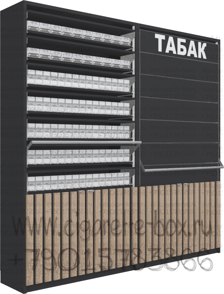 Шкаф для сигарет с синхронными дверками с тумбой для товарного запаса распашными дверями изготавливается из плиты ЛДСП - МДФ и поставляется в собранном виде, все механизмы синхронизации и внутренняя фурнитура изготавливаются из металла, у данной модели 7(семь) полок по высоте каждая полка комплектуется сигаретными пушерами без регулировки по ширине в которые можно установить 10-12 пачек сигарет по глубине, все створки открываются и закрываются одновременно заезжая под полку на одной створке размешается слово табак 18+ шкаф комплектуются хромированной ручкой рычагом которую можно отрегулировать по высоте.